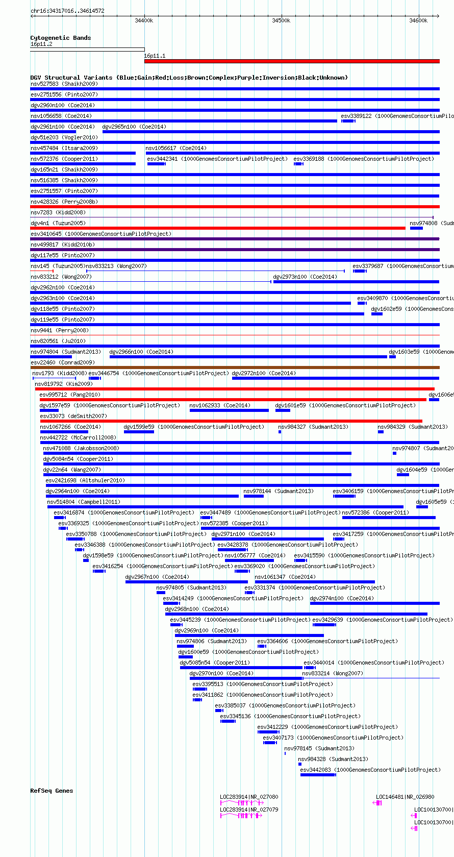 Variant DetailsVariant: nsv1057401| Internal ID | 19146620 | | Landmark | | | Location Information | | | Cytoband | 16p11.1 | | Allele length | | Assembly | Allele length | | hg38 | 297557 | | hg19 | 297557 | | hg18 | 297557 |