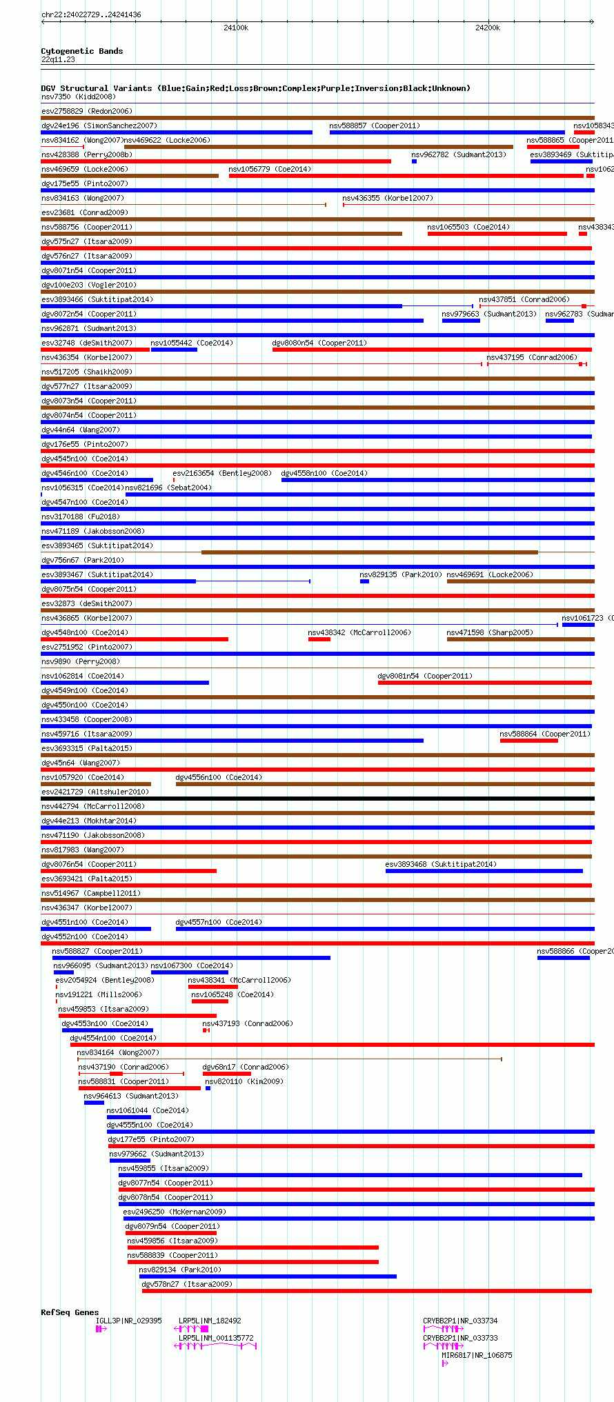 Variant DetailsVariant: nsv1057402| Internal ID | 19146621 | | Landmark | | | Location Information | | | Cytoband | 22q11.23 | | Allele length | | Assembly | Allele length | | hg38 | 218708 | | hg19 | 218708 | | hg18 | 218708 |