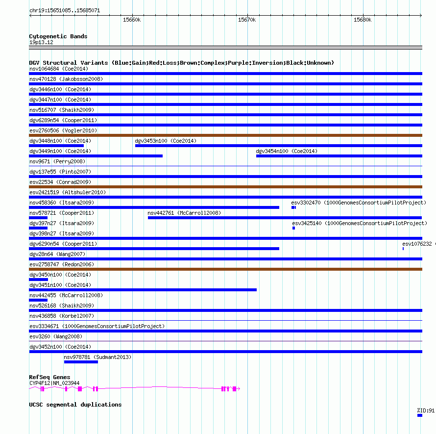 Variant DetailsVariant: nsv1057537| Internal ID | 18800068 | | Landmark | | | Location Information | | | Cytoband | 19p13.12 | | Allele length | | Assembly | Allele length | | hg38 | 33987 | | hg19 | 33987 | | hg18 | 33987 |