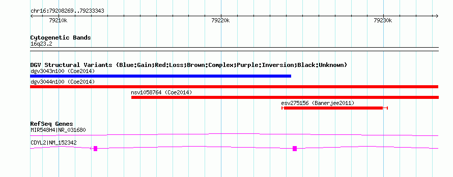 | | Variant Type | CNV loss | | Copy Number | | | Allele State | | | Allele Origin | | | Probe Count | | | Validation Flag | | | Merged Status | M | | Merged Variants | dgv3044n100 | | Supporting Variants | nssv3559790 | | Samples | | | Known Genes | CDYL2, MIR548H4 | | Method | SNP array | | Analysis | Affymetrix SNP array copy number analysis | | Platform | Affymetrix SNP Array 6.0 | | Comments | | | Reference | Coe_et_al_2014 | | Pubmed ID | 25217958 | | Accession Number(s) | nsv1057562