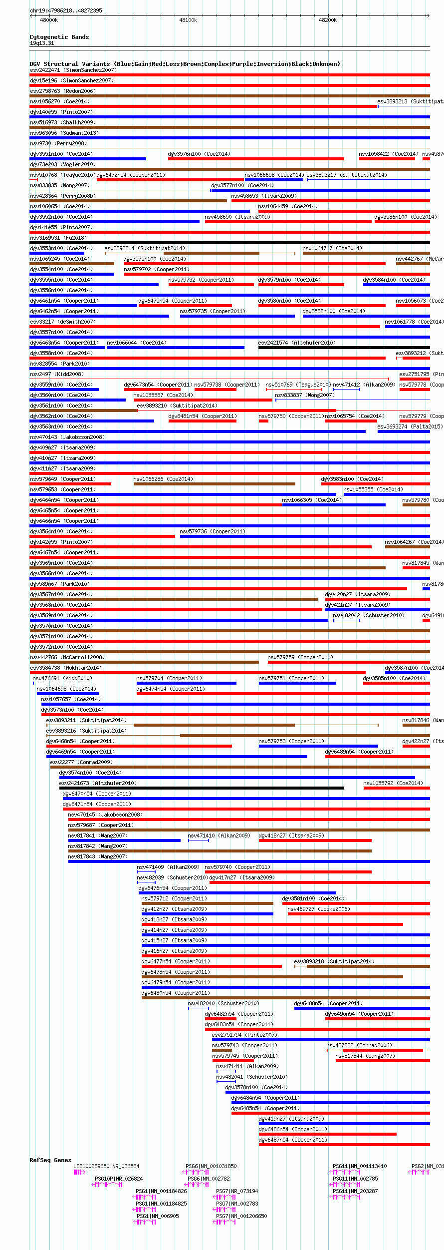 Variant DetailsVariant: nsv1057586| Internal ID | 19146805 | | Landmark | | | Location Information | | | Cytoband | 19q13.2 | | Allele length | | Assembly | Allele length | | hg38 | 286178 | | hg19 | 286178 | | hg18 | 286178 |