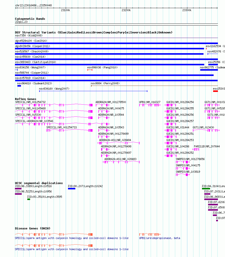 | Variant Type | CNV gain | Copy Number | | Allele State | | Allele Origin | | Probe Count | | Validation Flag | | Merged Status | M | Merged Variants | | Supporting Variants | nssv3588050 | Samples | | Known Genes | ADORA2A, ADORA2A-AS1, FAM211B, GGT1, GUCD1, SNRPD3, SPECC1L, SPECC1L-ADORA2A, UPB1 | Method | SNP array | Analysis | Affymetrix SNP array copy number analysis | Platform | Affymetrix SNP Array 6.0 | Comments | | Reference | Coe_et_al_2014 | Pubmed ID | 25217958 | Accession Number(s) | nsv1057819