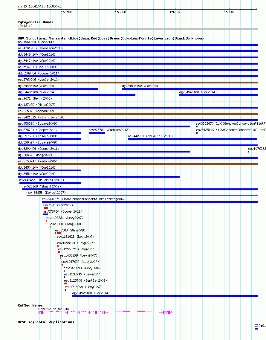 Variant DetailsVariant: nsv1057902| Internal ID | 18800433 | | Landmark | | | Location Information | | | Cytoband | 19p13.12 | | Allele length | | Assembly | Allele length | | hg38 | 44031 | | hg19 | 44031 | | hg18 | 44031 |