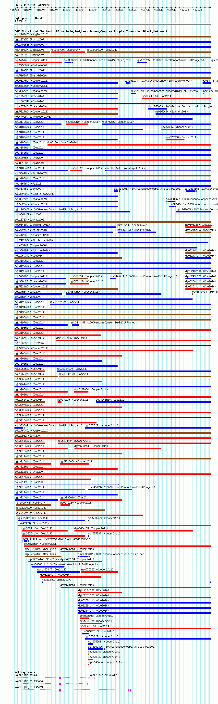 Variant DetailsVariant: nsv1057914| Internal ID | 19147133 | | Landmark | | | Location Information | | | Cytoband | 17q21.31 | | Allele length | | Assembly | Allele length | | hg38 | 150005 | | hg19 | 150005 | | hg18 | 150005 |