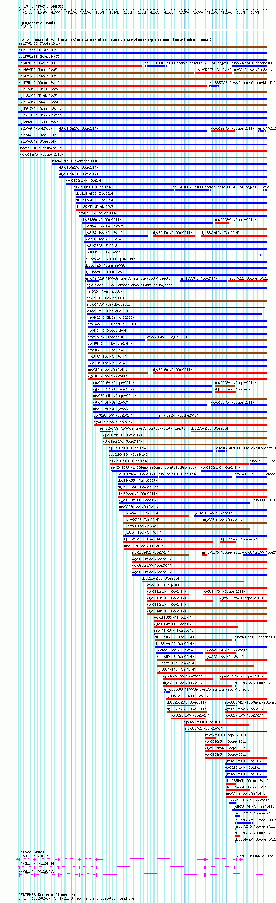 Variant DetailsVariant: nsv1057963| Internal ID | 19147182 | | Landmark | | | Location Information | | | Cytoband | 17q21.31 | | Allele length | | Assembly | Allele length | | hg38 | 175884 | | hg19 | 175884 | | hg18 | 175814 |