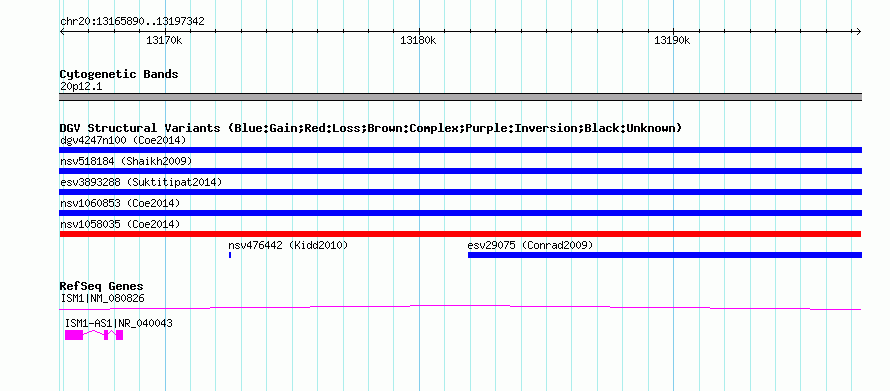 Variant DetailsVariant: nsv1058035| Internal ID | 19147254 | | Landmark | | | Location Information | | | Cytoband | 20p12.1 | | Allele length | | Assembly | Allele length | | hg38 | 31453 | | hg19 | 31453 | | hg18 | 31453 |