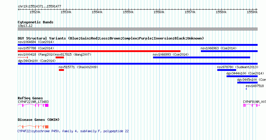 Variant DetailsVariant: nsv1058037| Internal ID | 19147256 | | Landmark | | | Location Information | | | Cytoband | 19p13.12 | | Allele length | | Assembly | Allele length | | hg38 | 77107 | | hg19 | 77107 | | hg18 | 77107 |