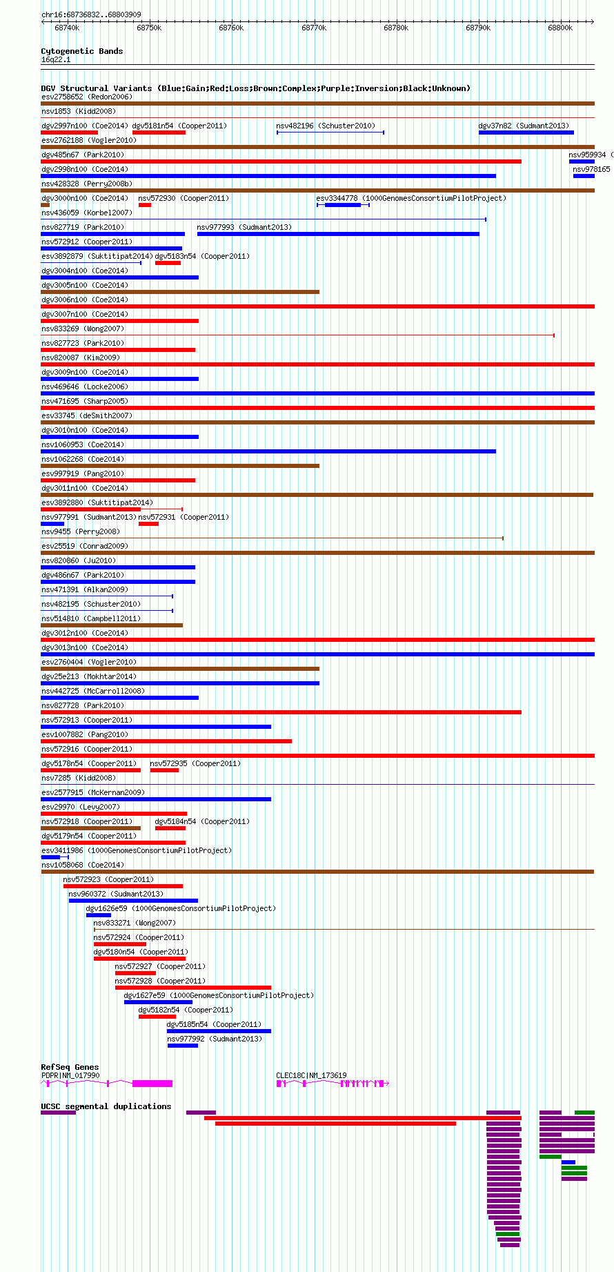 | Variant Type | CNV gain+loss | Copy Number | | Allele State | | Allele Origin | | Probe Count | | Validation Flag | | Merged Status | M | Merged Variants | | Supporting Variants | nssv3719021, nssv3719022, nssv3719023, nssv3559545, nssv3559543, nssv3559544 | Samples | | Known Genes | CLEC18C, PDPR | Method | SNP array | Analysis | Affymetrix SNP array copy number analysis | Platform | Affymetrix SNP Array 6.0 | Comments | | Reference | Coe_et_al_2014 | Pubmed ID | 25217958 | Accession Number(s) | nsv1058068