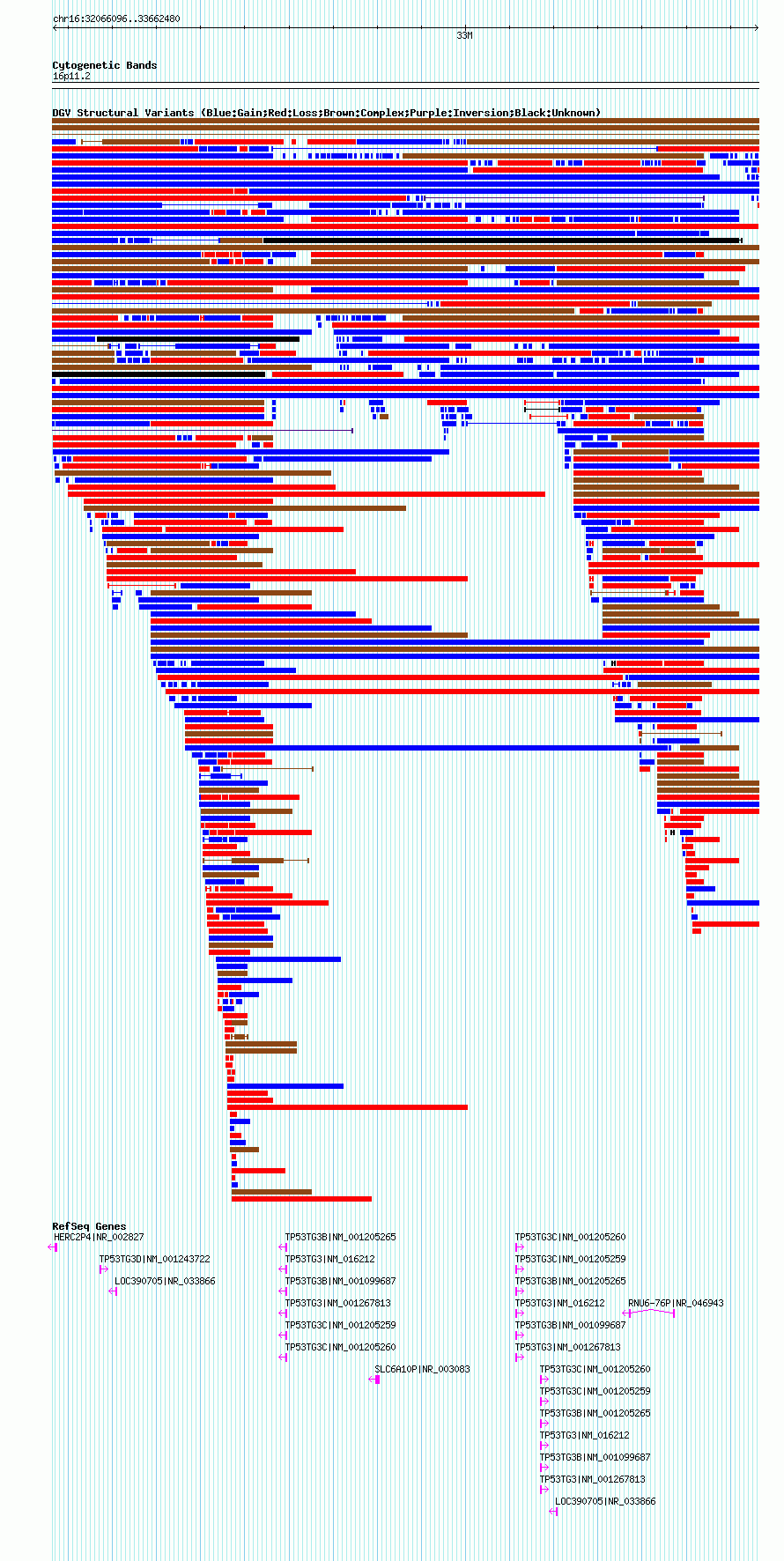 Variant DetailsVariant: nsv1058082| Internal ID | 19147301 | | Landmark | | | Location Information | | | Cytoband | 16p11.2 | | Allele length | | Assembly | Allele length | | hg38 | 1805239 | | hg19 | 1596385 | | hg18 | 1596385 |