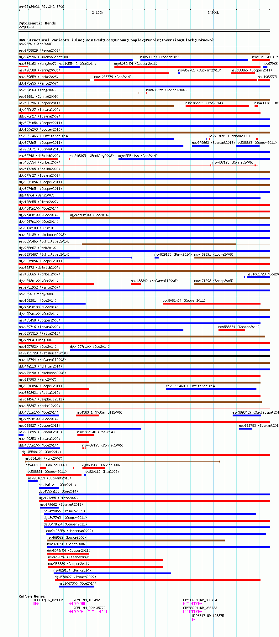 Variant DetailsVariant: nsv1058142| Internal ID | 19147361 | | Landmark | | | Location Information | | | Cytoband | 22q11.23 | | Allele length | | Assembly | Allele length | | hg38 | 217231 | | hg19 | 217231 | | hg18 | 217231 |