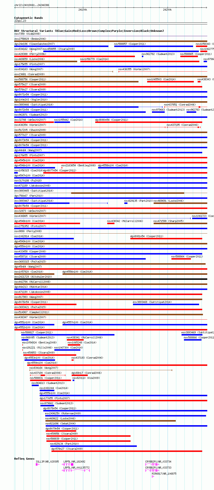 Variant DetailsVariant: nsv1058210| Internal ID | 19147429 | | Landmark | | | Location Information | | | Cytoband | 22q11.23 | | Allele length | | Assembly | Allele length | | hg38 | 227326 | | hg19 | 227326 | | hg18 | 227326 |