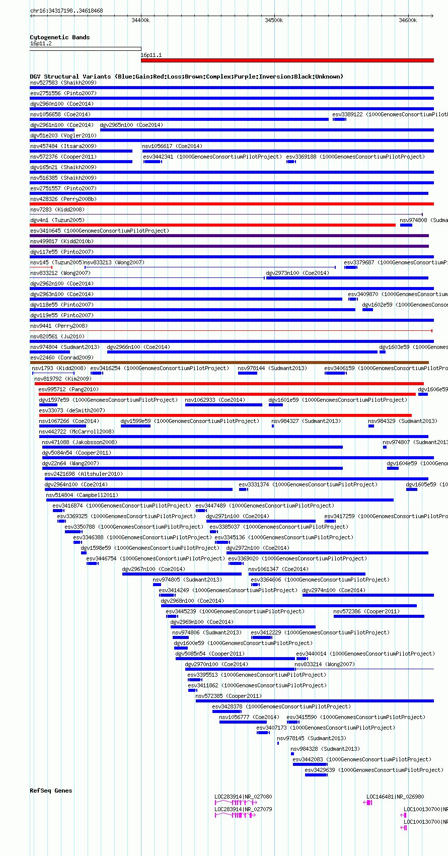 Variant DetailsVariant: nsv1058284| Internal ID | 19147503 | | Landmark | | | Location Information | | | Cytoband | 16p11.1 | | Allele length | | Assembly | Allele length | | hg38 | 301271 | | hg19 | 301271 | | hg18 | 301271 |