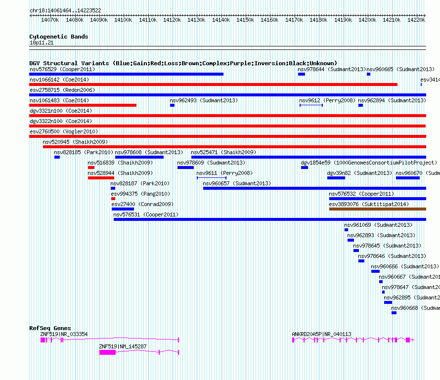 Variant DetailsVariant: nsv1058322| Internal ID | 19147541 | | Landmark | | | Location Information | | | Cytoband | 18p11.21 | | Allele length | | Assembly | Allele length | | hg38 | 162059 | | hg19 | 162059 | | hg18 | 162059 |