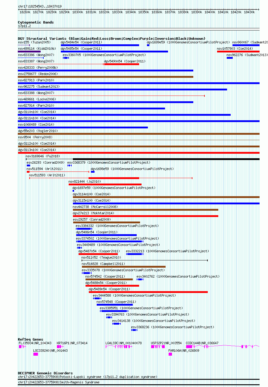 Variant DetailsVariant: nsv1058346| Internal ID | 19147565 | | Landmark | | | Location Information | | | Cytoband | 17p11.2 | | Allele length | | Assembly | Allele length | | hg38 | 182477 | | hg19 | 182477 | | hg18 | 182477 |