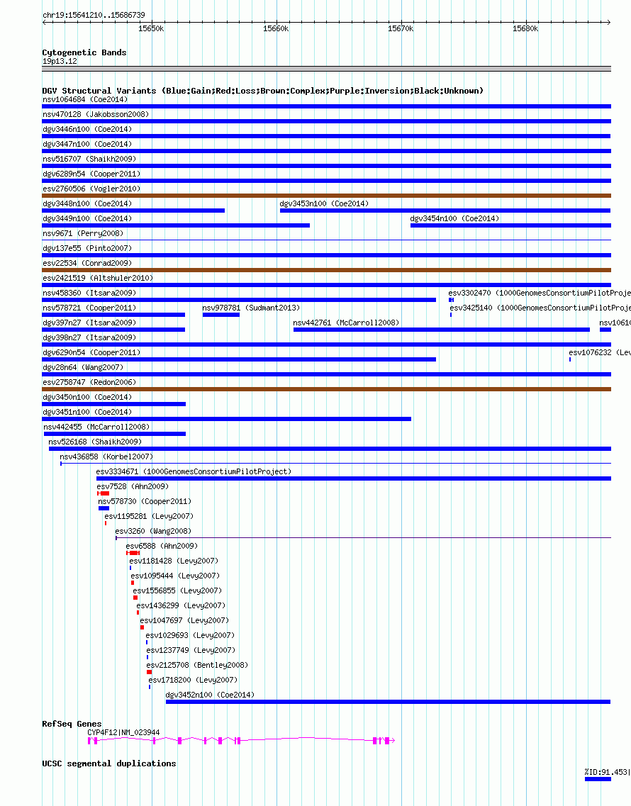 Variant DetailsVariant: nsv1058441| Internal ID | 18800972 | | Landmark | | | Location Information | | | Cytoband | 19p13.12 | | Allele length | | Assembly | Allele length | | hg38 | 45530 | | hg19 | 45530 | | hg18 | 45530 |