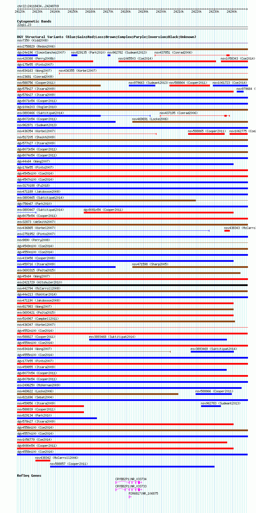 Variant DetailsVariant: nsv1058551| Internal ID | 19147770 | | Landmark | | | Location Information | | | Cytoband | 22q11.23 | | Allele length | | Assembly | Allele length | | hg38 | 130276 | | hg19 | 130276 | | hg18 | 130276 |