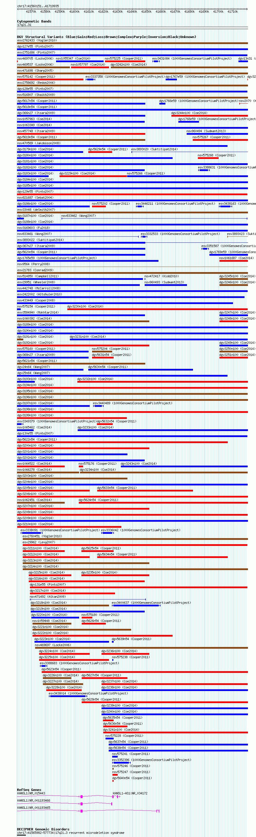 | | Variant Type | CNV gain+loss | | Copy Number | | | Allele State | | | Allele Origin | | | Probe Count | | | Validation Flag | | | Merged Status | M | | Merged Variants | dgv3195n100 | | Supporting Variants | nssv3549864, nssv3549865, nssv3720894, nssv3720895, nssv3549867, nssv3549868, nssv3549862, nssv3549866, nssv3549863, nssv3720890, nssv3549874, nssv3720889, nssv3549861, nssv3720896, nssv3549869, nssv3720893, nssv3720892, nssv3549870, nssv3549872, nssv3720891, nssv3549875, nssv3549871, nssv3549873 | | Samples | | | Known Genes | KANSL1, KANSL1-AS1, LOC644172 | | Method | SNP array | | Analysis | Affymetrix SNP array copy number analysis | | Platform | Affymetrix SNP Array 6.0 | | Comments | | | Reference | Coe_et_al_2014 | | Pubmed ID | 25217958 | | Accession Number(s) | nsv1058570