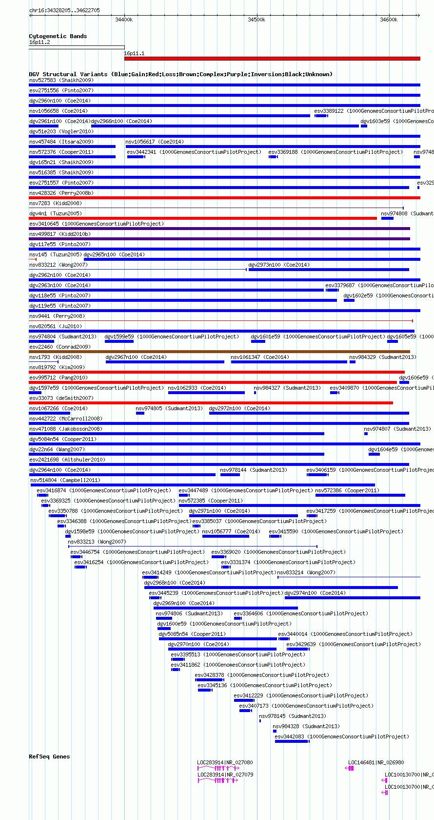 Variant DetailsVariant: nsv1058754| Internal ID | 19147973 | | Landmark | | | Location Information | | | Cytoband | 16p11.1 | | Allele length | | Assembly | Allele length | | hg38 | 294501 | | hg19 | 294501 | | hg18 | 294501 |