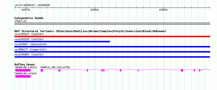 | | Variant Type | CNV gain | | Copy Number | | | Allele State | | | Allele Origin | | | Probe Count | | | Validation Flag | | | Merged Status | M | | Merged Variants | | | Supporting Variants | nssv3584834 | | Samples | | | Known Genes | PABPC1L, YWHAB | | Method | SNP array | | Analysis | Affymetrix SNP array copy number analysis | | Platform | Affymetrix SNP Array 6.0 | | Comments | | | Reference | Coe_et_al_2014 | | Pubmed ID | 25217958 | | Accession Number(s) | nsv1058850