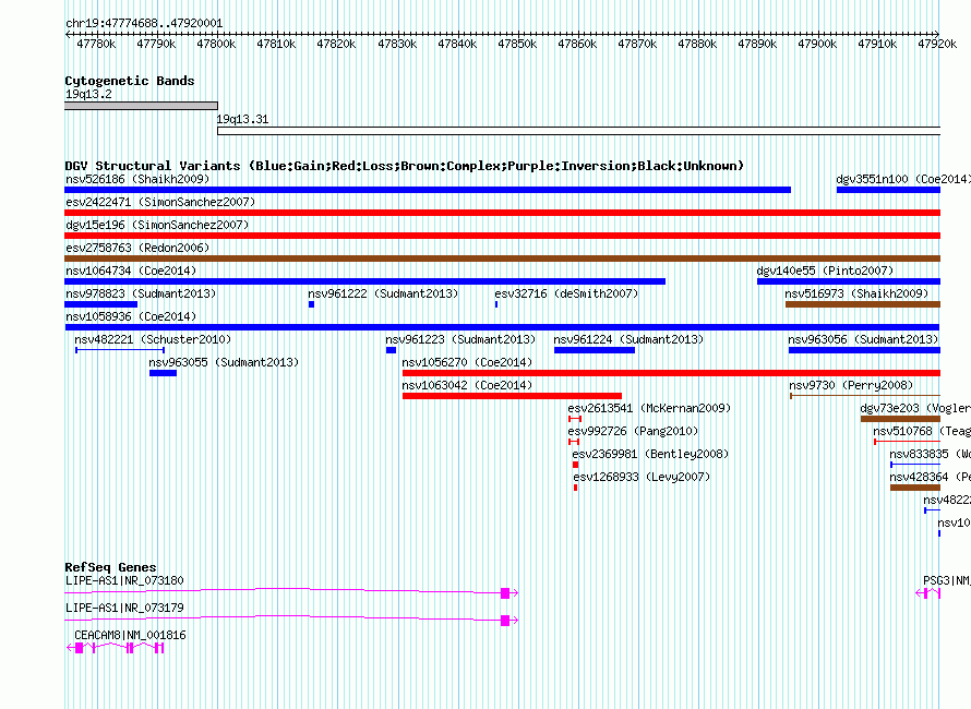 | | Variant Type | CNV gain | | Copy Number | | | Allele State | | | Allele Origin | | | Probe Count | | | Validation Flag | | | Merged Status | M | | Merged Variants | | | Supporting Variants | nssv3568651 | | Samples | | | Known Genes | CEACAM8, LIPE-AS1, PSG3 | | Method | SNP array | | Analysis | Affymetrix SNP array copy number analysis | | Platform | Affymetrix SNP Array 6.0 | | Comments | | | Reference | Coe_et_al_2014 | | Pubmed ID | 25217958 | | Accession Number(s) | nsv1058936