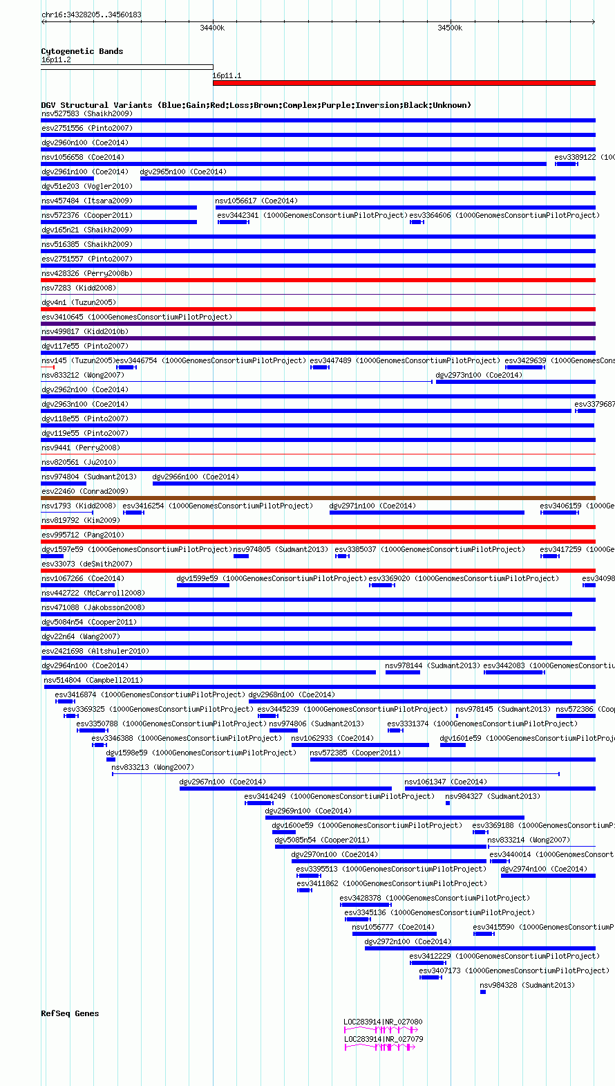 Variant DetailsVariant: nsv1058997| Internal ID | 19148216 | | Landmark | | | Location Information | | | Cytoband | 16p11.1 | | Allele length | | Assembly | Allele length | | hg38 | 231979 | | hg19 | 231979 | | hg18 | 231979 |
