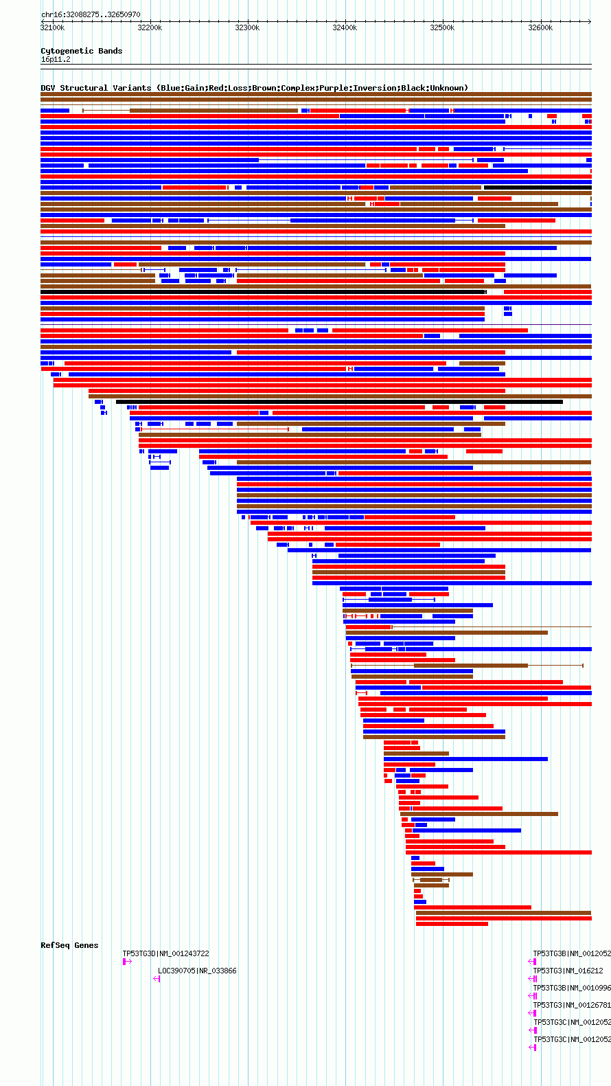| | Variant Type | CNV gain | | Copy Number | | | Allele State | | | Allele Origin | | | Probe Count | | | Validation Flag | | | Merged Status | M | | Merged Variants | dgv2851n100 | | Supporting Variants | nssv3550374, nssv3550373 | | Samples | | | Known Genes | LOC390705, TP53TG3, TP53TG3B, TP53TG3C, TP53TG3D | | Method | SNP array | | Analysis | Affymetrix SNP array copy number analysis | | Platform | Affymetrix SNP Array 6.0 | | Comments | | | Reference | Coe_et_al_2014 | | Pubmed ID | 25217958 | | Accession Number(s) | nsv1059008
