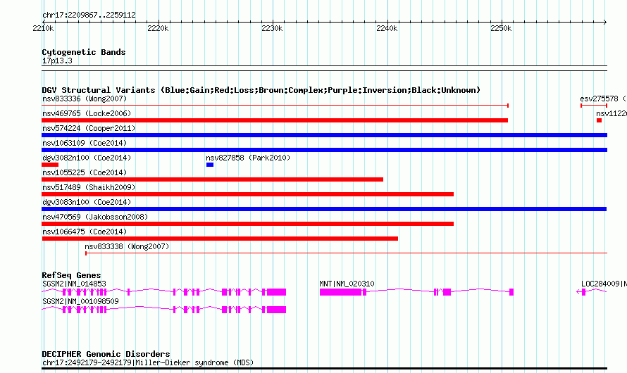 | Variant Type | CNV gain | Copy Number | | Allele State | | Allele Origin | | Probe Count | | Validation Flag | | Merged Status | M | Merged Variants | dgv3083n100 | Supporting Variants | nssv3560080 | Samples | | Known Genes | LOC284009, MNT, SGSM2 | Method | SNP array | Analysis | Affymetrix SNP array copy number analysis | Platform | Affymetrix SNP Array 6.0 | Comments | | Reference | Coe_et_al_2014 | Pubmed ID | 25217958 | Accession Number(s) | nsv1059182