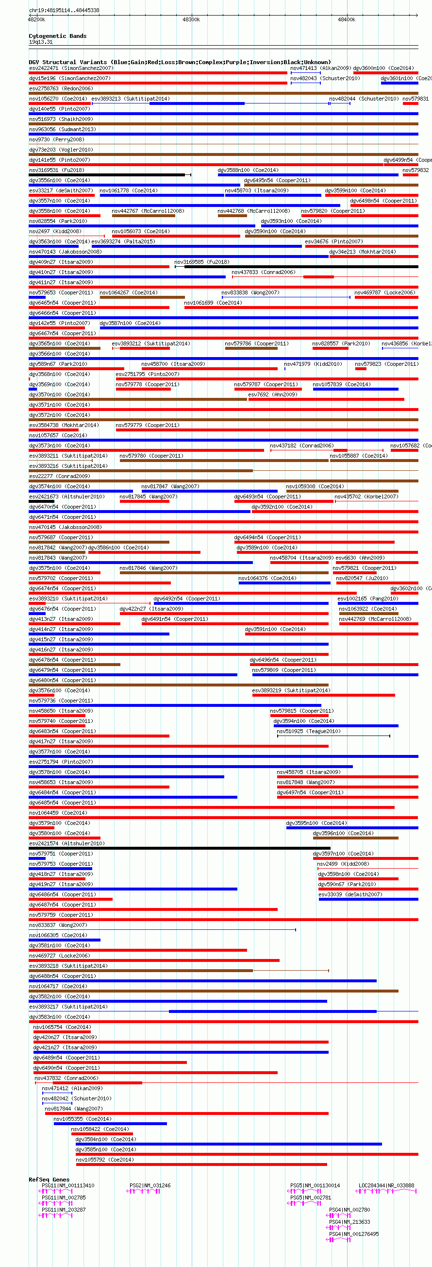 Variant DetailsVariant: nsv1059245| Internal ID | 19148464 | | Landmark | | | Location Information | | | Cytoband | 19q13.31 | | Allele length | | Assembly | Allele length | | hg38 | 250225 | | hg19 | 250225 | | hg18 | 250225 |
