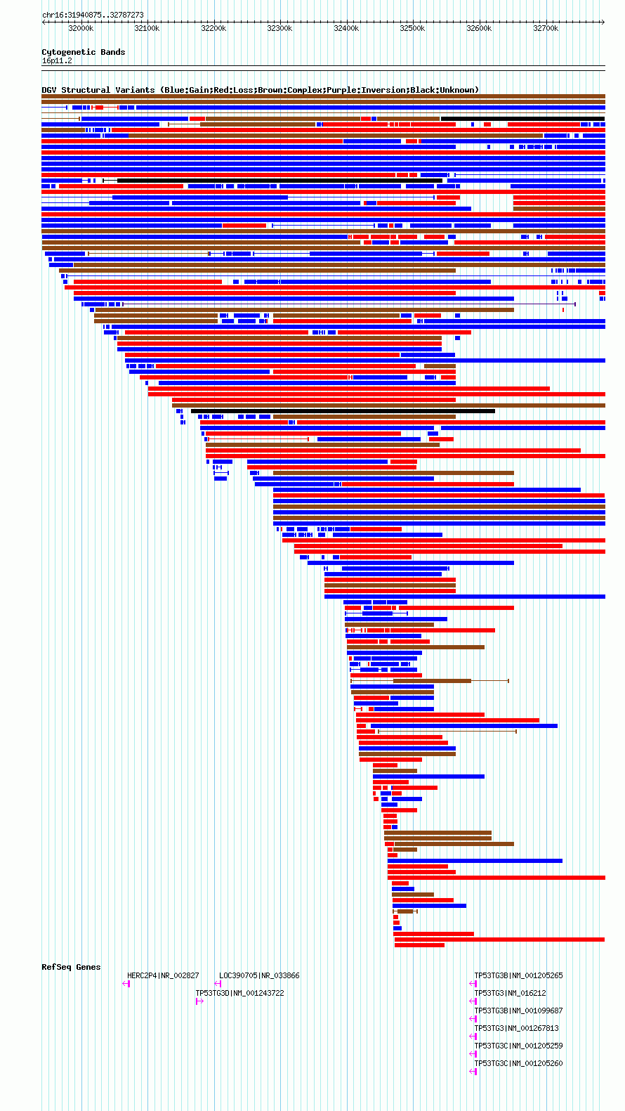 | | Variant Type | CNV gain+loss | | Copy Number | | | Allele State | | | Allele Origin | | | Probe Count | | | Validation Flag | | | Merged Status | M | | Merged Variants | dgv2847n100 | | Supporting Variants | nssv3549215, nssv3716203 | | Samples | | | Known Genes | HERC2P4, LOC390705, TP53TG3, TP53TG3B, TP53TG3C, TP53TG3D | | Method | SNP array | | Analysis | Affymetrix SNP array copy number analysis | | Platform | Affymetrix SNP Array 6.0 | | Comments | | | Reference | Coe_et_al_2014 | | Pubmed ID | 25217958 | | Accession Number(s) | nsv1059261