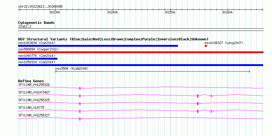 Variant DetailsVariant: nsv1059314| Internal ID | 19148533 | | Landmark | | | Location Information | | | Cytoband | 22q12.2 | | Allele length | | Assembly | Allele length | | hg38 | 42476 | | hg19 | 42476 | | hg18 | 42476 |