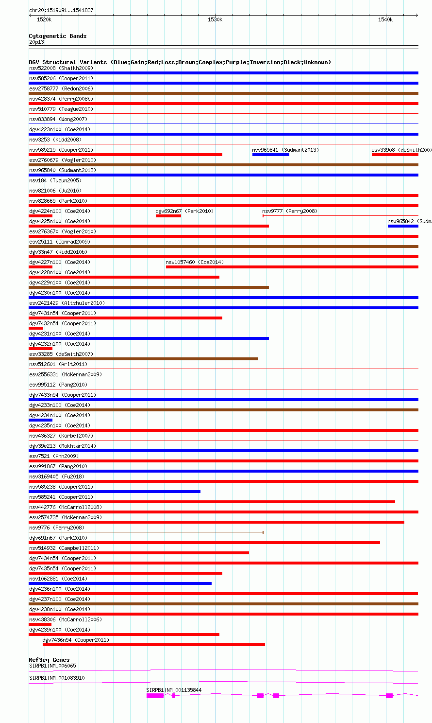 Variant DetailsVariant: nsv1059452| Internal ID | 19148671 | | Landmark | | | Location Information | | | Cytoband | 20p13 | | Allele length | | Assembly | Allele length | | hg38 | 22747 | | hg19 | 22747 | | hg18 | 22747 |
