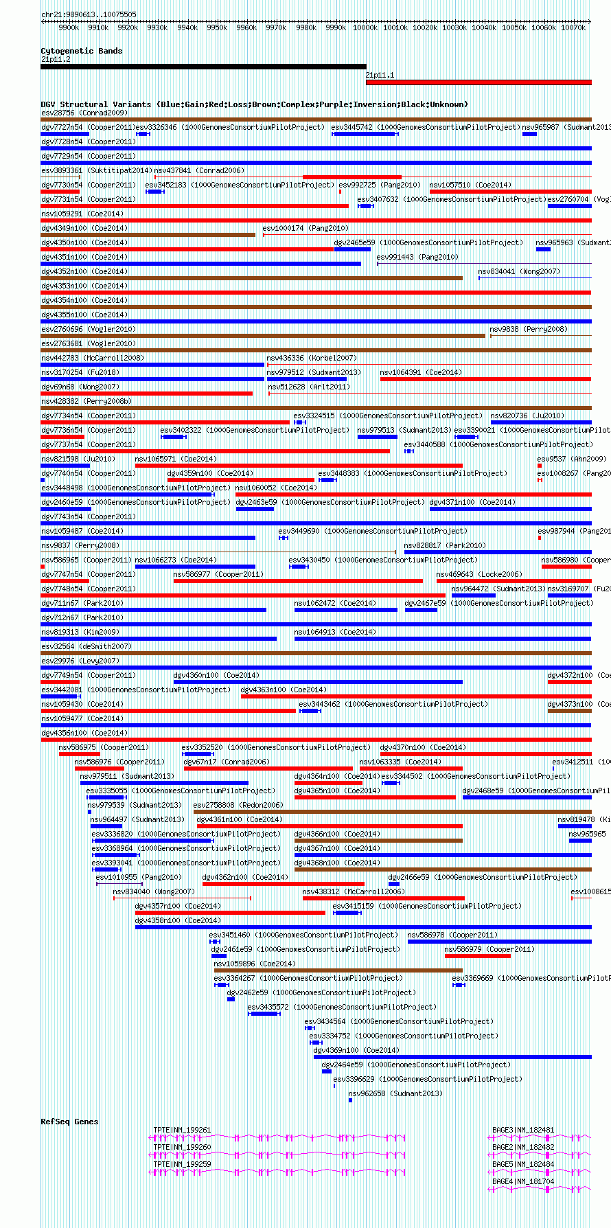 Variant DetailsVariant: nsv1059477| Internal ID | 19148696 | | Landmark | | | Location Information | | | Cytoband | 21p11.1 | | Allele length | | Assembly | Allele length | | hg38 | 184893 | | hg19 | 184893 | | hg18 | 184893 |