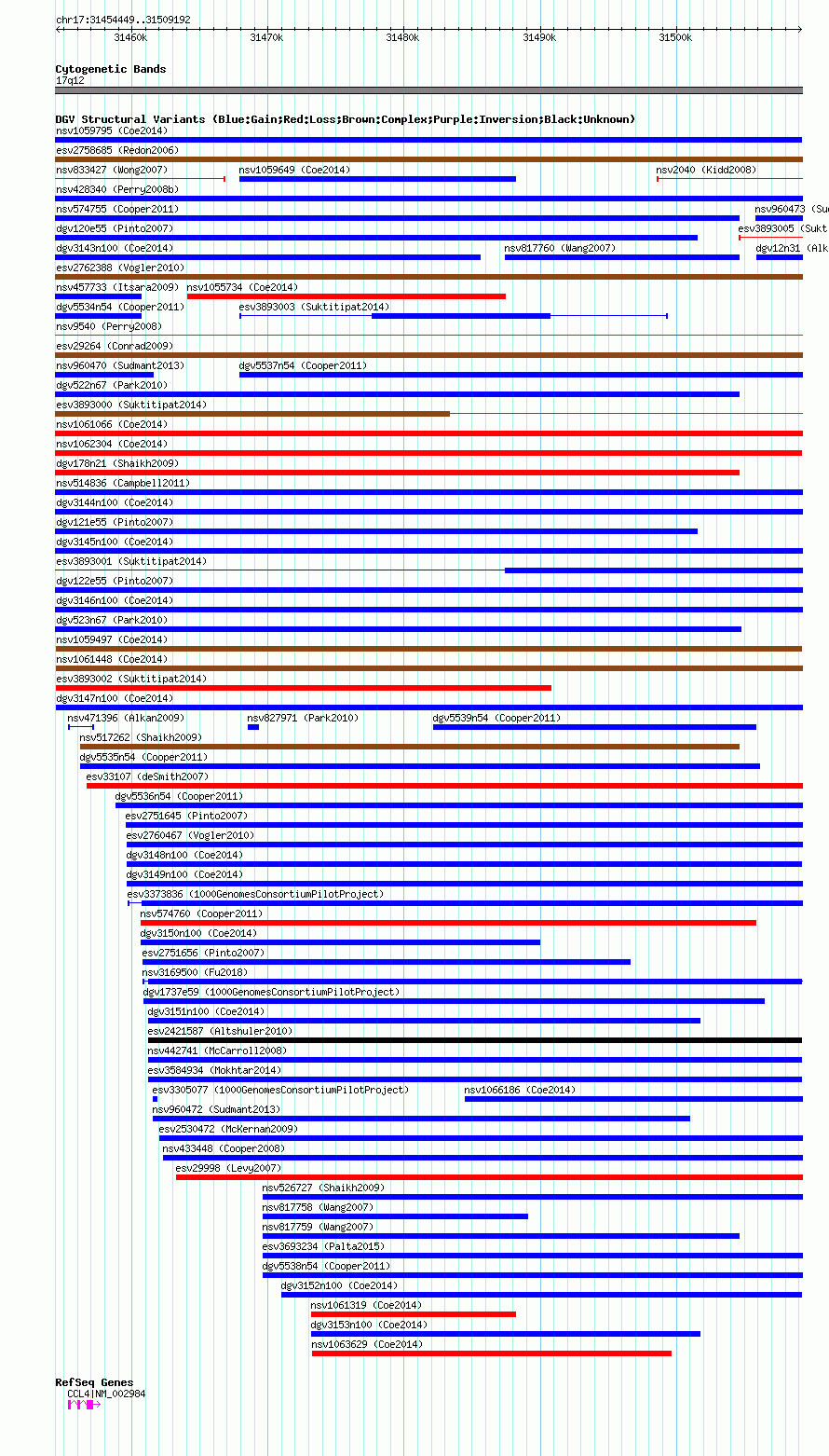 Variant DetailsVariant: nsv1059497| Internal ID | 19148716 | | Landmark | | | Location Information | | | Cytoband | 17q12 | | Allele length | | Assembly | Allele length | | hg38 | 54764 | | hg19 | 54744 | | hg18 | 54744 |