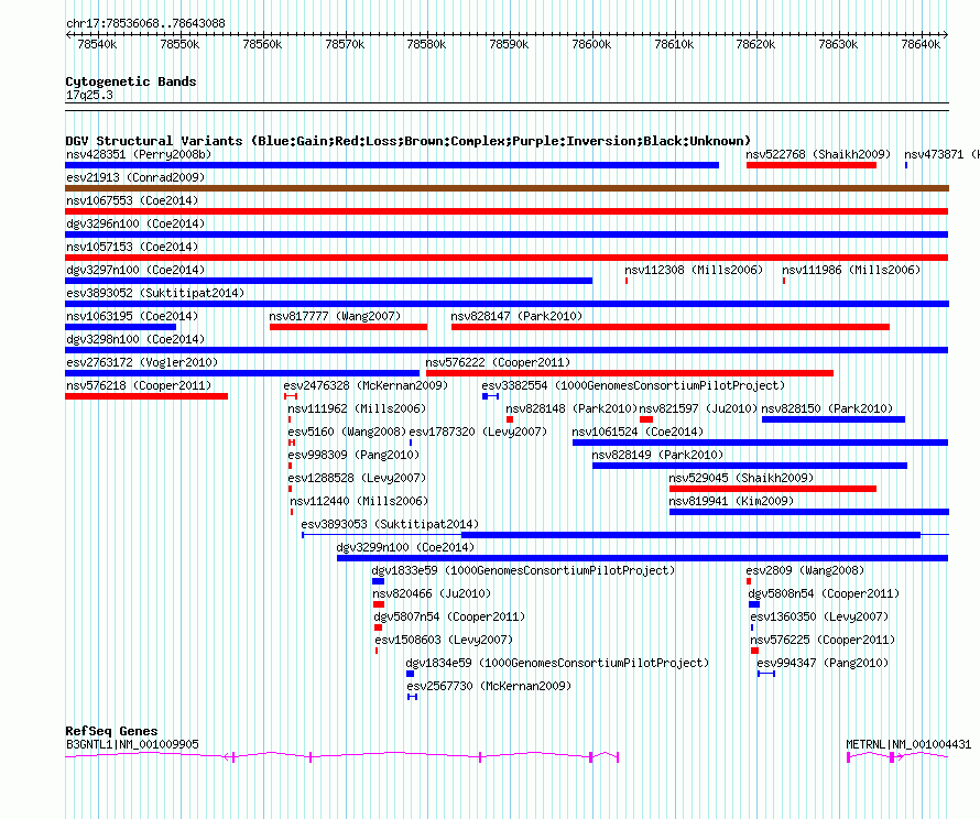 | | Variant Type | CNV gain | | Copy Number | | | Allele State | | | Allele Origin | | | Probe Count | | | Validation Flag | | | Merged Status | M | | Merged Variants | dgv3298n100 | | Supporting Variants | nssv3567909 | | Samples | | | Known Genes | B3GNTL1, METRNL | | Method | SNP array | | Analysis | Affymetrix SNP array copy number analysis | | Platform | Affymetrix SNP Array 6.0 | | Comments | | | Reference | Coe_et_al_2014 | | Pubmed ID | 25217958 | | Accession Number(s) | nsv1059548