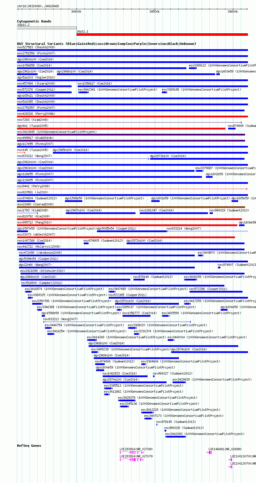 Variant DetailsVariant: nsv1059628 | Internal ID | 19148847 | | Landmark | | | Location Information | | | Cytoband | 16p11.1 | | Allele length | | Assembly | Allele length | | hg38 | 294409 | | hg19 | 294409 | | hg18 | 294409 |