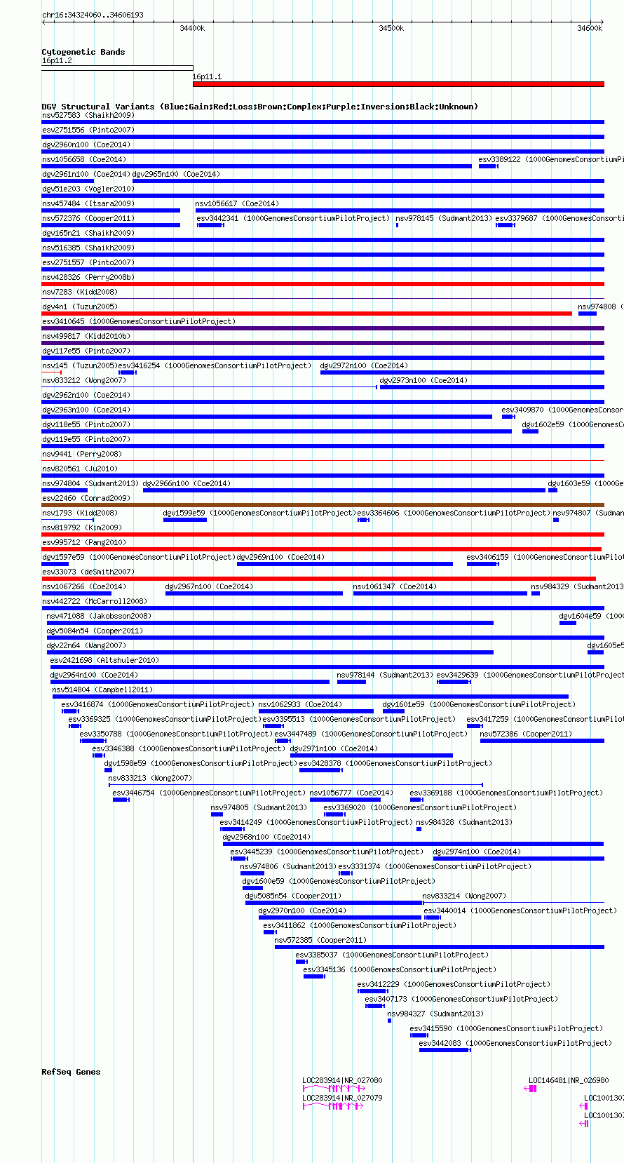 Variant DetailsVariant: nsv1059662| Internal ID | 19148881 | | Landmark | | | Location Information | | | Cytoband | 16p11.1 | | Allele length | | Assembly | Allele length | | hg38 | 282134 | | hg19 | 282134 | | hg18 | 282134 |