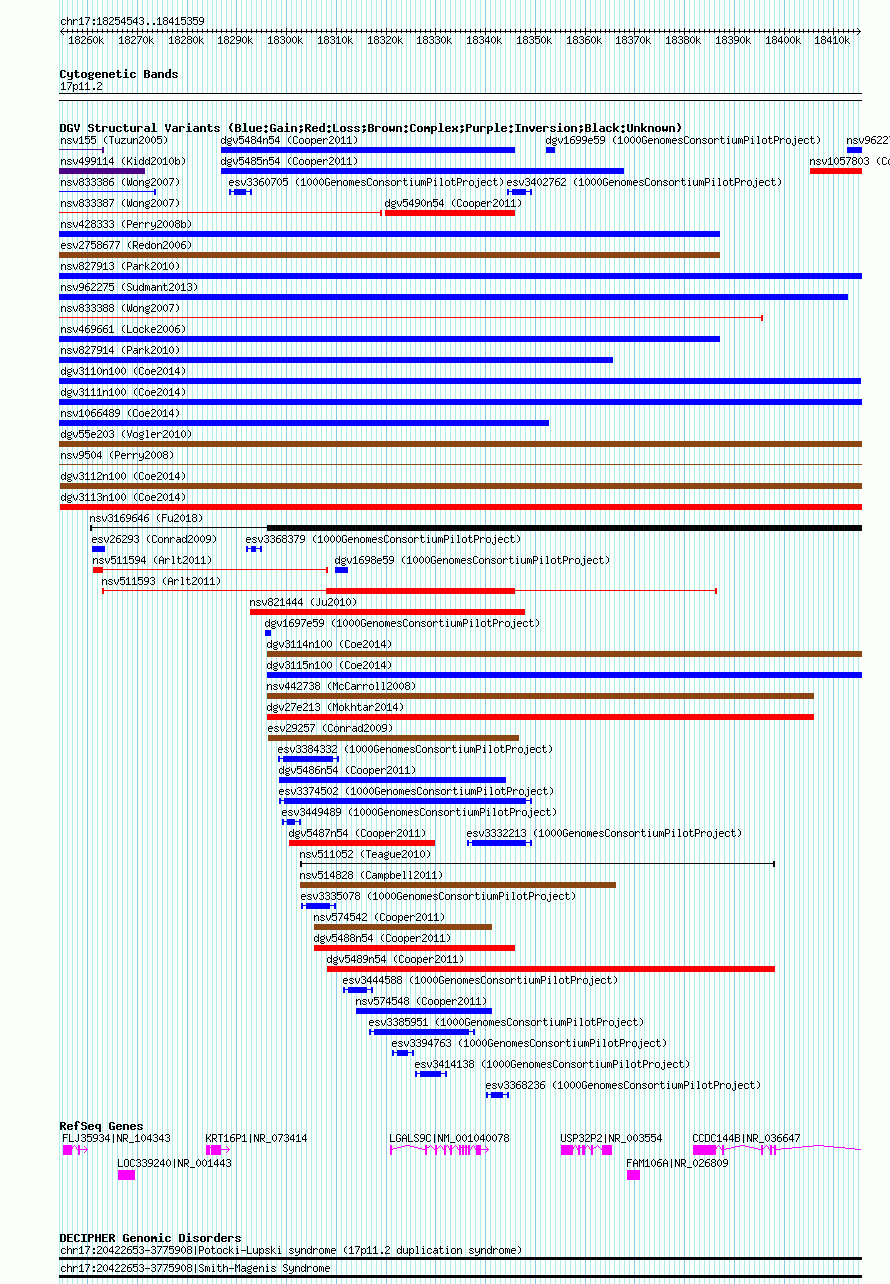 Variant DetailsVariant: nsv1059979 | Internal ID | 19149198 | | Landmark | | | Location Information | | | Cytoband | 17p11.2 | | Allele length | | Assembly | Allele length | | hg38 | 160817 | | hg19 | 160817 | | hg18 | 160817 |