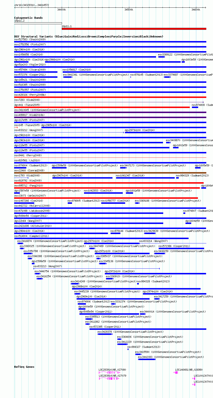 Variant DetailsVariant: nsv1060070 | Internal ID | 19149289 | | Landmark | | | Location Information | | | Cytoband | 16p11.1 | | Allele length | | Assembly | Allele length | | hg38 | 285263 | | hg19 | 285263 | | hg18 | 285263 |
