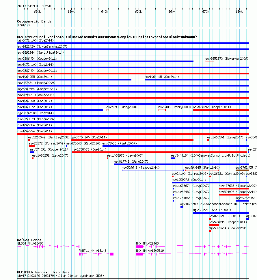 Variant DetailsVariant: nsv1060084| Internal ID | 19149303 | | Landmark | | | Location Information | | | Cytoband | 17p13.3 | | Allele length | | Assembly | Allele length | | hg38 | 68638 | | hg19 | 68638 | | hg18 | 68638 |