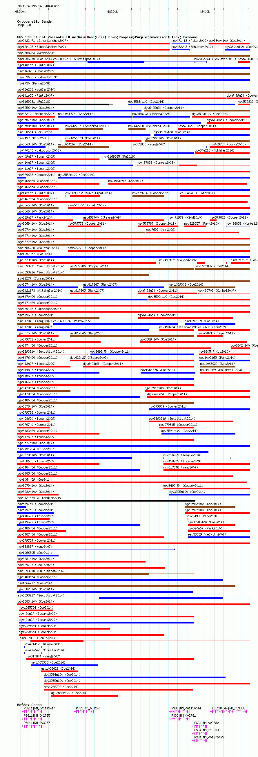 Variant DetailsVariant: nsv1060095| Internal ID | 19149314 | | Landmark | | | Location Information | | | Cytoband | 19q13.31 | | Allele length | | Assembly | Allele length | | hg38 | 251670 | | hg19 | 251670 | | hg18 | 251670 |