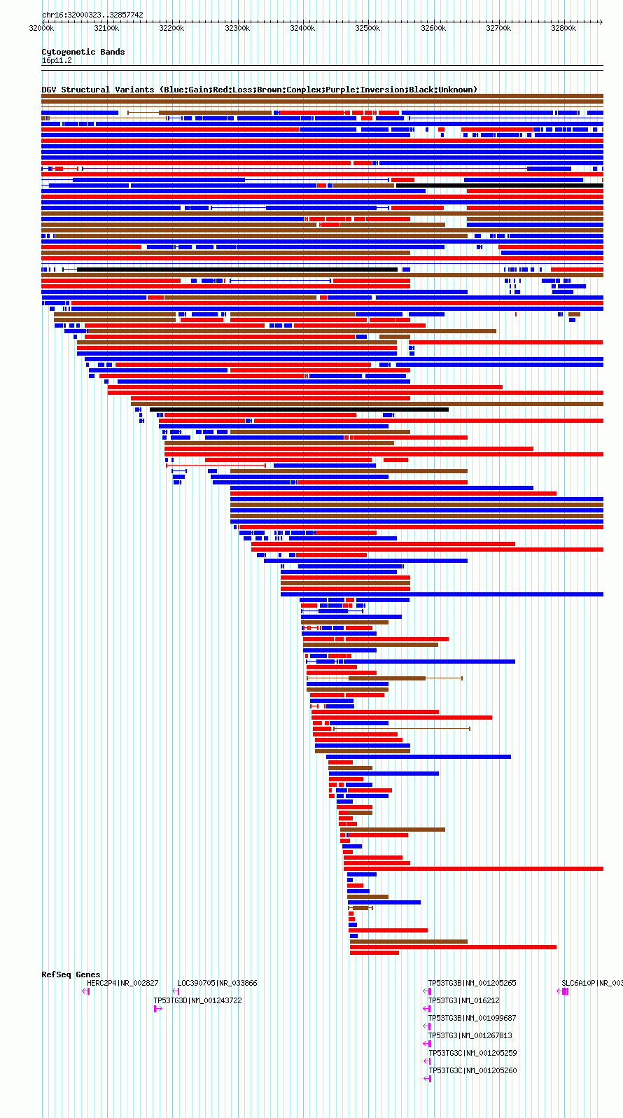 | | Variant Type | CNV loss | | Copy Number | | | Allele State | | | Allele Origin | | | Probe Count | | | Validation Flag | | | Merged Status | M | | Merged Variants | dgv2841n100 | | Supporting Variants | nssv3549382 | | Samples | | | Known Genes | HERC2P4, LOC390705, SLC6A10P, TP53TG3, TP53TG3B, TP53TG3C, TP53TG3D | | Method | SNP array | | Analysis | Affymetrix SNP array copy number analysis | | Platform | Affymetrix SNP Array 6.0 | | Comments | | | Reference | Coe_et_al_2014 | | Pubmed ID | 25217958 | | Accession Number(s) | nsv1060168