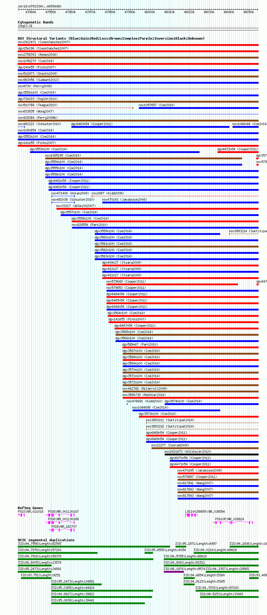 Variant DetailsVariant: nsv1060190| Internal ID | 18802721 | | Landmark | | | Location Information | | | Cytoband | 19q13.2 | | Allele length | | Assembly | Allele length | | hg38 | 121141 | | hg19 | 121141 | | hg18 | 121141 |
