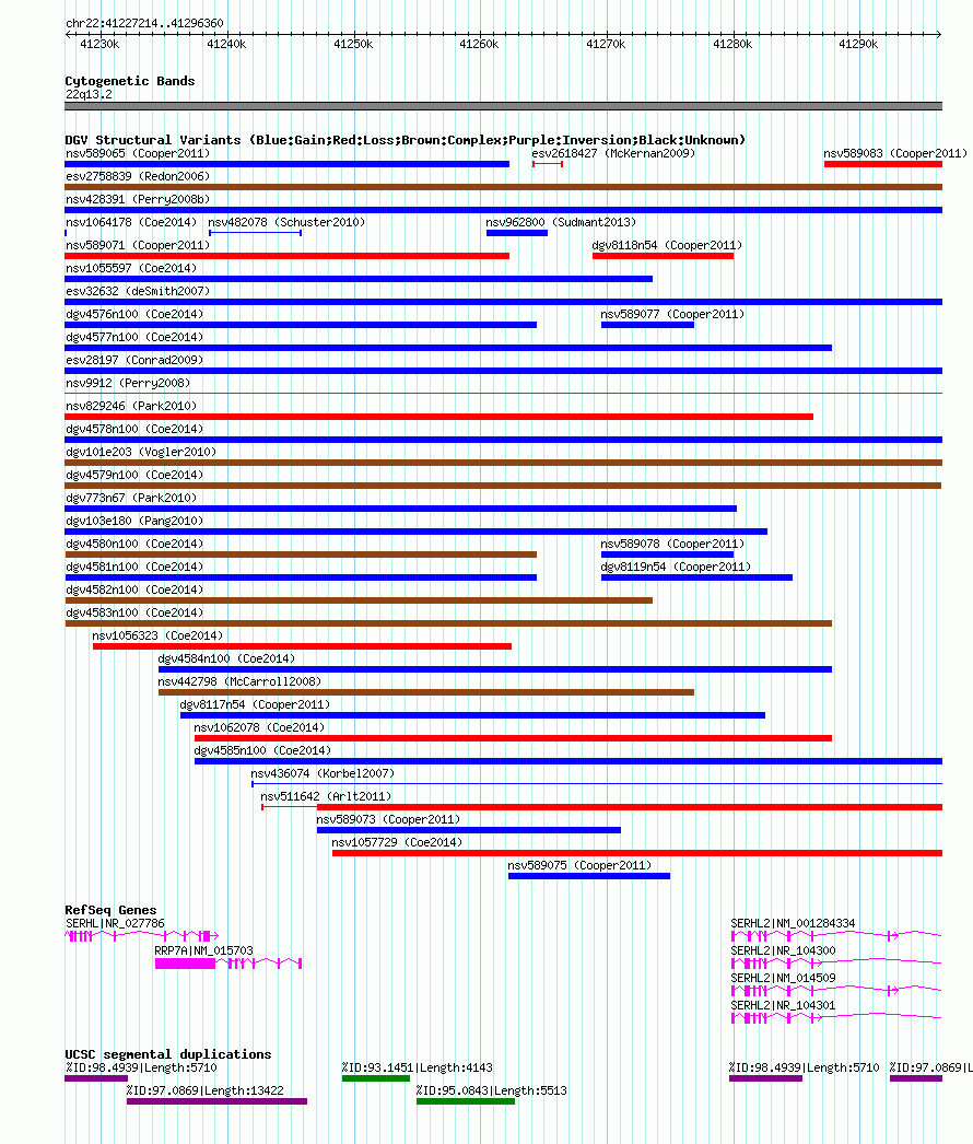 | Variant Type | CNV gain | Copy Number | | Allele State | | Allele Origin | | Probe Count | | Validation Flag | | Merged Status | M | Merged Variants | dgv4578n100 | Supporting Variants | nssv3737414, nssv3592060, nssv3737415, nssv3592062, nssv3592063, nssv3592061, nssv3737416, nssv3592068, nssv3592064, nssv3592067, nssv3592066, nssv3592065, nssv3592059 | Samples | | Known Genes | RRP7A, SERHL, SERHL2 | Method | SNP array | Analysis | Affymetrix SNP array copy number analysis | Platform | Affymetrix SNP Array 6.0 | Comments | | Reference | Coe_et_al_2014 | Pubmed ID | 25217958 | Accession Number(s) | nsv1060218