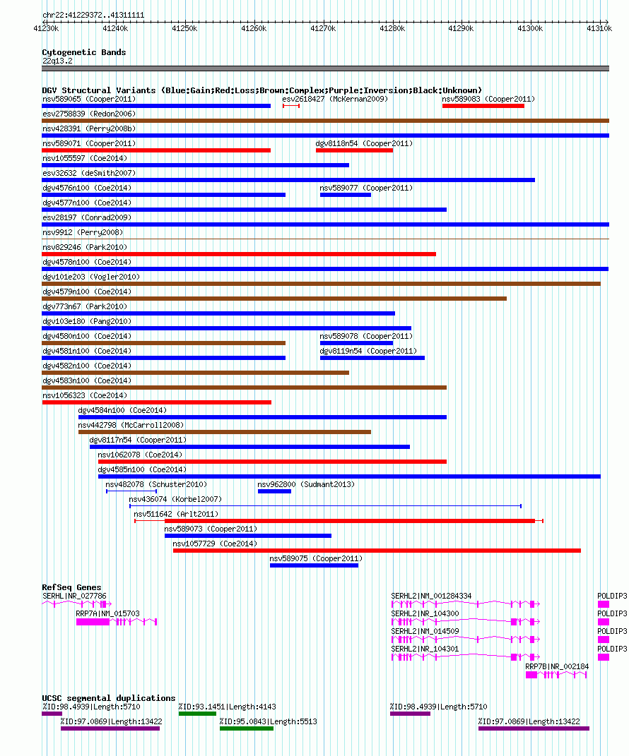 | Variant Type | CNV gain | Copy Number | | Allele State | | Allele Origin | | Probe Count | | Validation Flag | | Merged Status | M | Merged Variants | dgv4578n100 | Supporting Variants | nssv3592181 | Samples | | Known Genes | POLDIP3, RRP7A, RRP7B, SERHL, SERHL2 | Method | SNP array | Analysis | Affymetrix SNP array copy number analysis | Platform | Affymetrix SNP Array 6.0 | Comments | | Reference | Coe_et_al_2014 | Pubmed ID | 25217958 | Accession Number(s) | nsv1060243