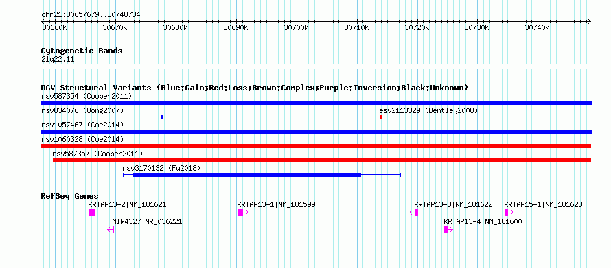 Variant DetailsVariant: nsv1060328| Internal ID | 19149547 | | Landmark | | | Location Information | | | Cytoband | 21q22.11 | | Allele length | | Assembly | Allele length | | hg38 | 91056 | | hg19 | 91056 | | hg18 | 91056 |