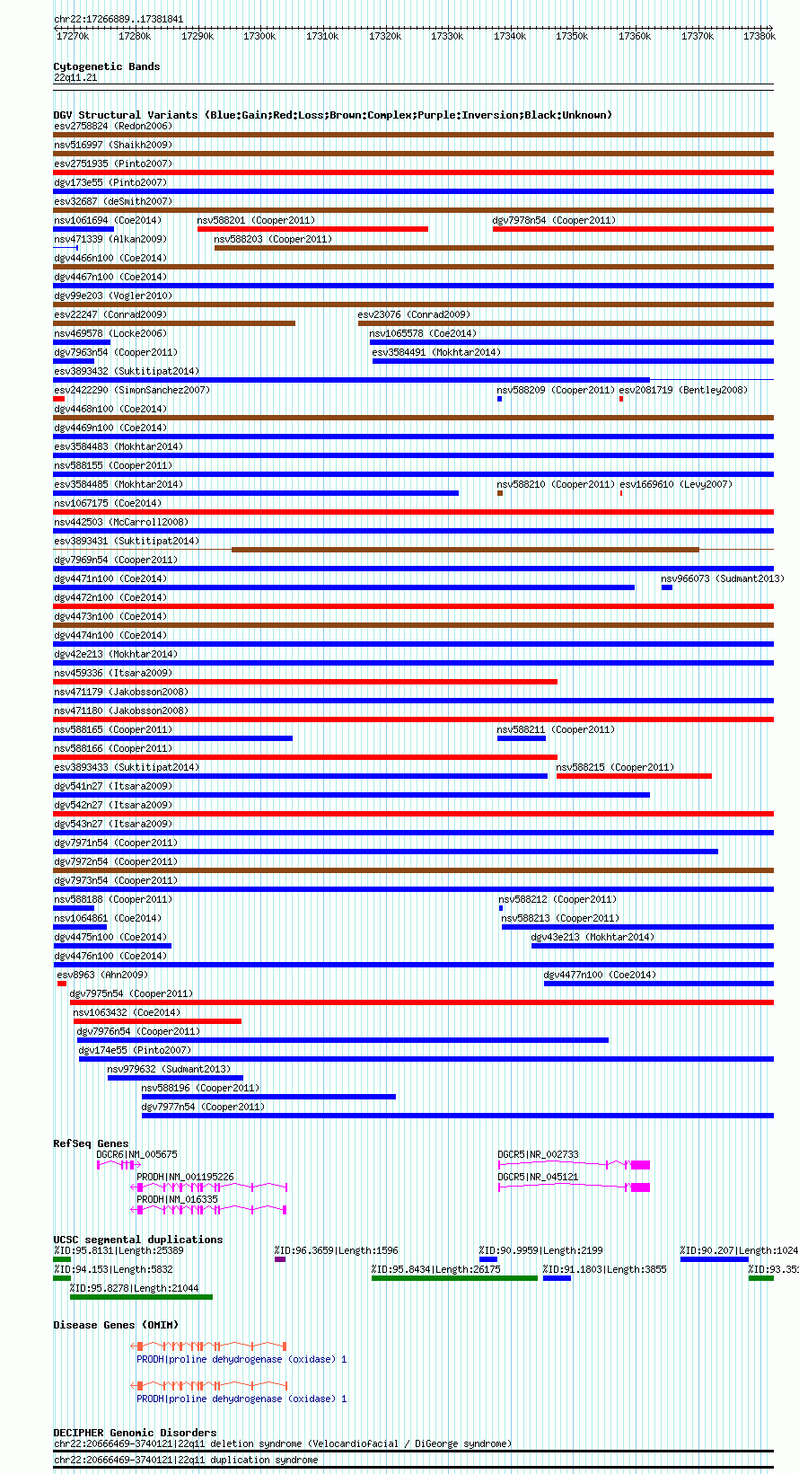 | Variant Type | CNV gain | Copy Number | | Allele State | | Allele Origin | | Probe Count | | Validation Flag | | Merged Status | M | Merged Variants | dgv4476n100 | Supporting Variants | nssv3587293 | Samples | | Known Genes | DGCR5, DGCR6, PRODH | Method | SNP array | Analysis | Affymetrix SNP array copy number analysis | Platform | Affymetrix SNP Array 6.0 | Comments | | Reference | Coe_et_al_2014 | Pubmed ID | 25217958 | Accession Number(s) | nsv1060562