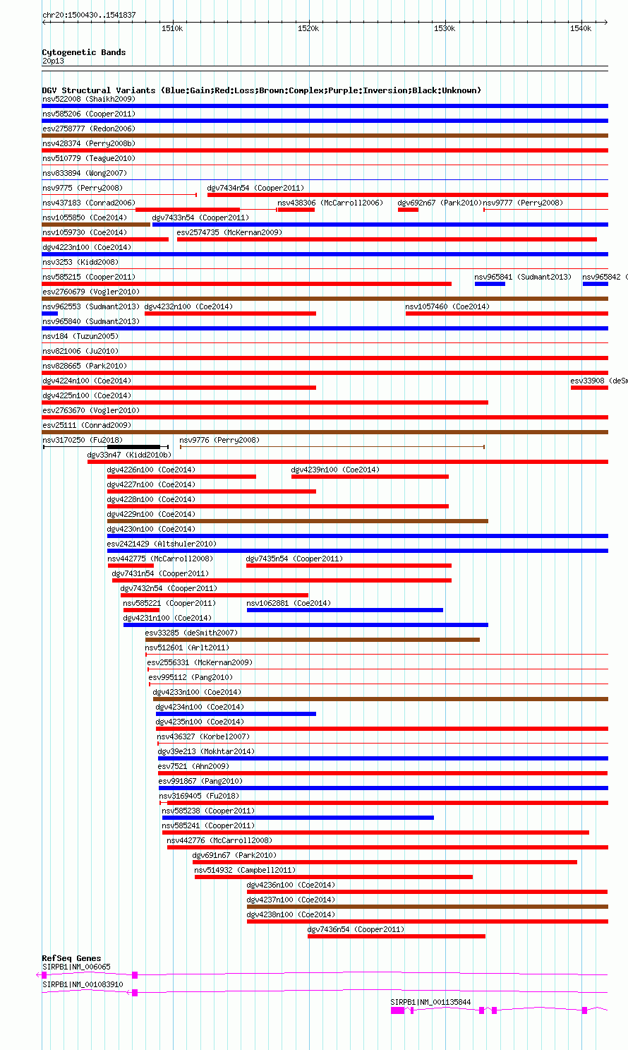 Variant DetailsVariant: nsv1060586| Internal ID | 19149805 | | Landmark | | | Location Information | | | Cytoband | 20p13 | | Allele length | | Assembly | Allele length | | hg38 | 41408 | | hg19 | 41408 | | hg18 | 41408 |
