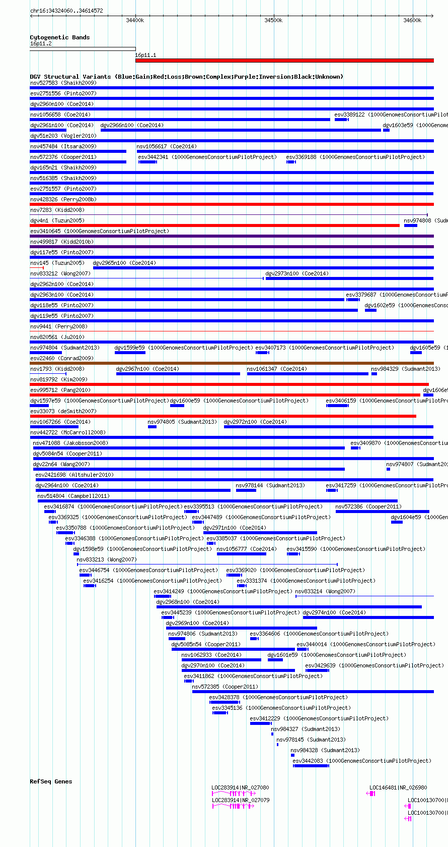 Variant DetailsVariant: nsv1060680 | Internal ID | 19149899 | | Landmark | | | Location Information | | | Cytoband | 16p11.1 | | Allele length | | Assembly | Allele length | | hg38 | 290513 | | hg19 | 290513 | | hg18 | 290513 |