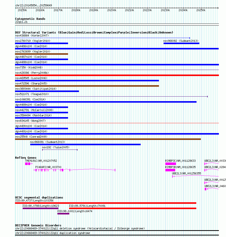 | | Variant Type | CNV gain | | Copy Number | | | Allele State | | | Allele Origin | | | Probe Count | | | Validation Flag | | | Merged Status | M | | Merged Variants | dgv4491n100 | | Supporting Variants | nssv3588811 | | Samples | | | Known Genes | PI4KAP2, RIMBP3B, RIMBP3C, TMEM191C, UBE2L3 | | Method | SNP array | | Analysis | Affymetrix SNP array copy number analysis | | Platform | Affymetrix SNP Array 6.0 | | Comments | | | Reference | Coe_et_al_2014 | | Pubmed ID | 25217958 | | Accession Number(s) | nsv1060781
