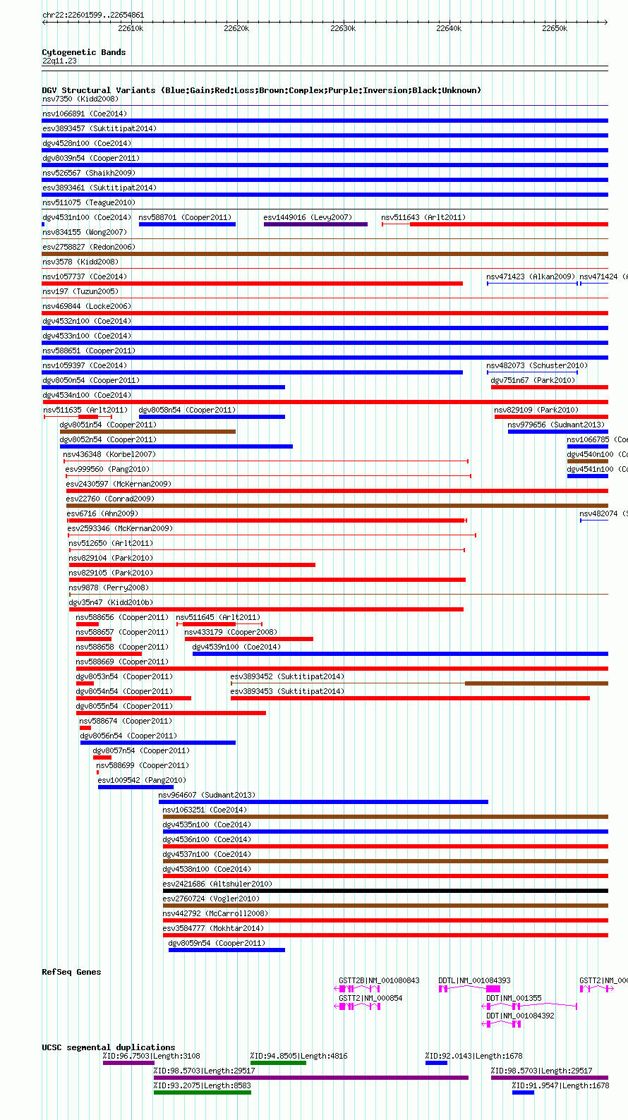 Variant DetailsVariant: nsv1060824| Internal ID | 18803355 | | Landmark | | | Location Information | | | Cytoband | 22q11.23 | | Allele length | | Assembly | Allele length | | hg38 | 53259 | | hg19 | 53263 | | hg18 | 53263 |